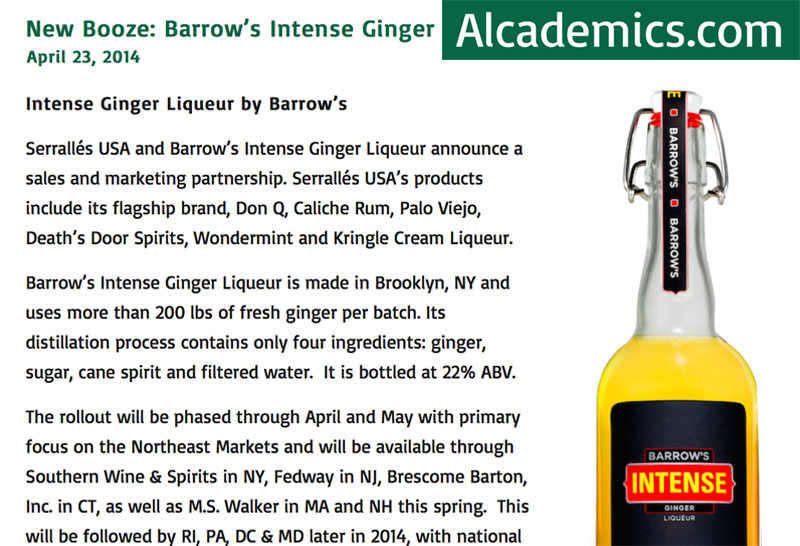 Barrow’s Intense Ginger Liqueur is made in Brooklyn, NY and uses more than 200 lbs of fresh ginger per batch. Its distillation process contains only four ingredients: ginger, sugar, cane spirit and filtered water. It is bottled at 22% ABV.